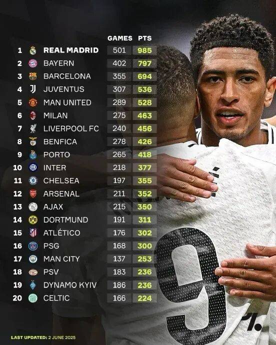 上赛季结束后,出现了一份欧冠历史总积分榜。虽然大巴黎获得冠军,但限于底蕴,他们的总积分很低,只有300分。而这份榜单的首位,自然是皇马。当时他们拿到985分。而本赛季首轮,皇马2:1击败马赛,积分提高到988分。